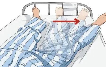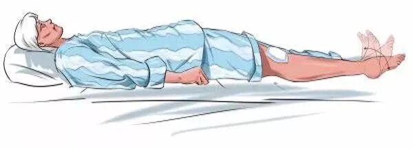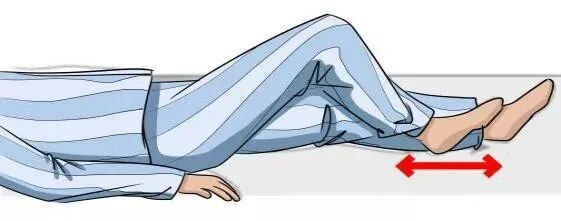 4. 下肢活动训练:在仰卧位下,脚跟沿床面往臀部方向滑动,到小腿屈曲至45°停住保持5秒,再缓慢将小腿沿床面伸直,10个一组,每次做3组,每天2次。