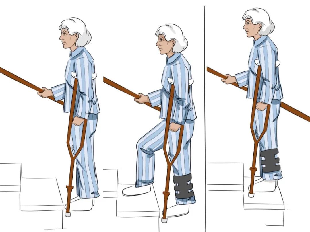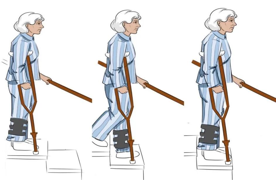 上楼梯双手撑住腋杖→好腿先上台阶,站稳→ 双侧腋杖和患肢一起跟上,站稳