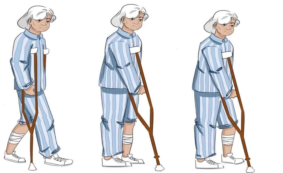 平地行走健侧手扶手杖,站稳→ 手杖和患肢同时向前迈步→ 健腿跟上