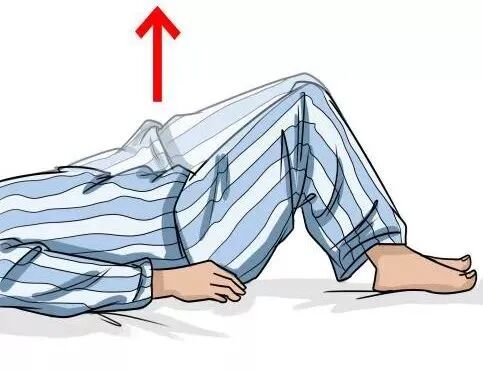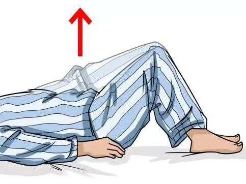 4. 桥式运动:仰卧位,双下肢屈膝90°,缓慢将臀部从床面抬离,终末端保持5秒,再缓慢收回,12个一组,每次做3组,每组之间休息30秒。每天2次。