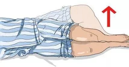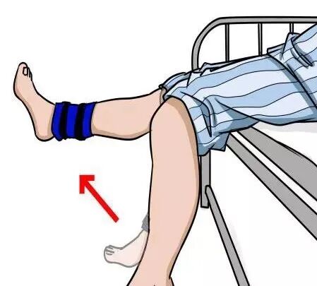 5. 直腿抬高:在仰卧位下,健侧下肢屈膝90°,患侧下肢在伸膝状态下,将大腿抬离床面20~30公分,终末端保持5秒,再缓慢收回,12个一组,每次做3组,每组之间休息30秒。每天2次。