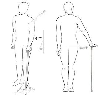 确定手杖高度的方法一:(1)身体直立,以肘关节屈曲30°,腕关节背屈约30°的状态握住手杖;(2)使手杖头位于脚尖前方和外侧方直角距离各15cm处的位置。确定手杖高度的方法二:人体直立,手杖高度与大转子(髋关节突起部)处于等高的位置