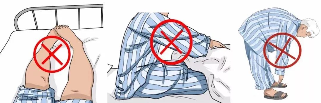 注意事项:避免髋关节屈曲超过90°,内收超过中线,内旋超过中立位,一次性长时间坐位不超过1小时,仰卧位时应使用外展垫枕,避免双腿交替性放置。