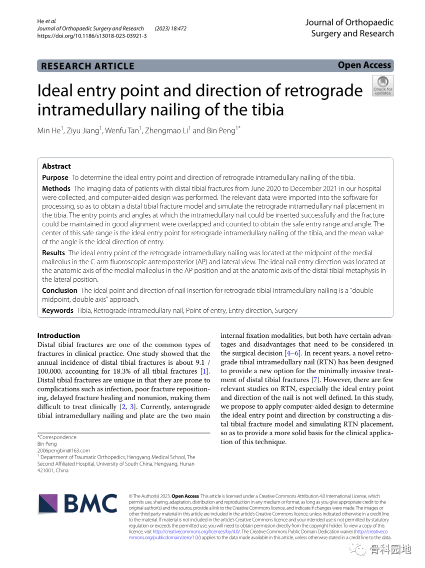 作者收集了26名胫骨远端骨折患者的影像学资料,计算能测量计算出植入髓内钉并保持骨折对齐的入钉点和入钉角度,得出安全入钉范围和入钉角度。此安全范围的中心是胫骨逆行髓内钉入钉的理想入钉点,角度的平均值是入钉的理想方向。
