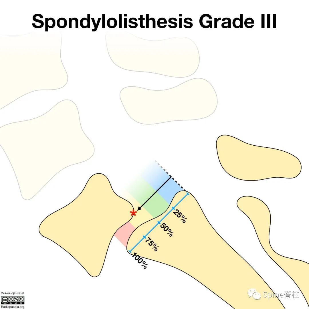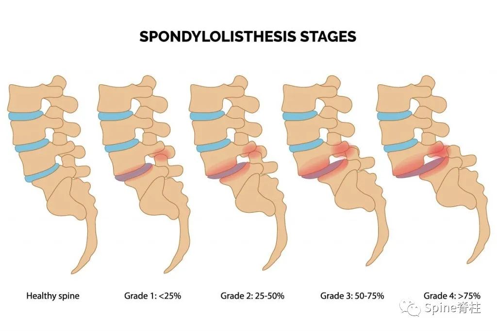 目前,腰椎滑脱常用的Meyerding分级系统,是将腰椎滑脱分为五级(Ⅰ-Ⅴ度)。将下位椎体上缘平均分为四个等份,评估上位椎体后缘线所处下位椎体的位置,以确定分级:0%至25%为Ⅰ度,25%至50%为Ⅱ度,50%至75%为Ⅲ度,75%至100%为Ⅳ度,大于100%为Ⅴ度。Ⅰ度和Ⅱ度通常被认为是低度滑脱,而Ⅲ级、Ⅳ级和V级则被认为是高度滑脱(严重滑脱)。V级也被称为脊柱下垂(前移),是一种大于100%的完全滑脱。但值得注意的是:Meyerding分级是通过使用站立、侧位腰椎X线片测量腰椎滑移程度来确定的。
