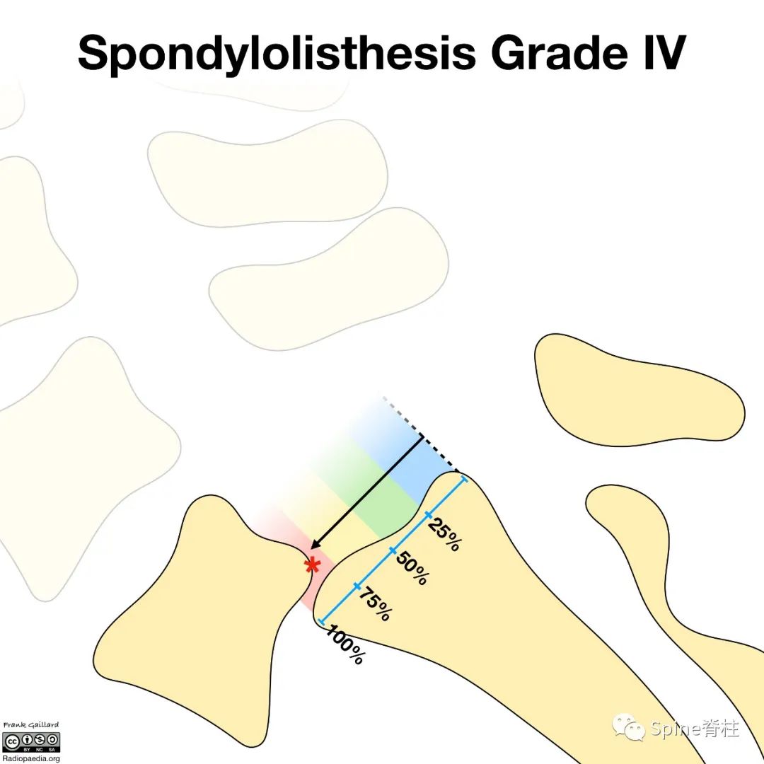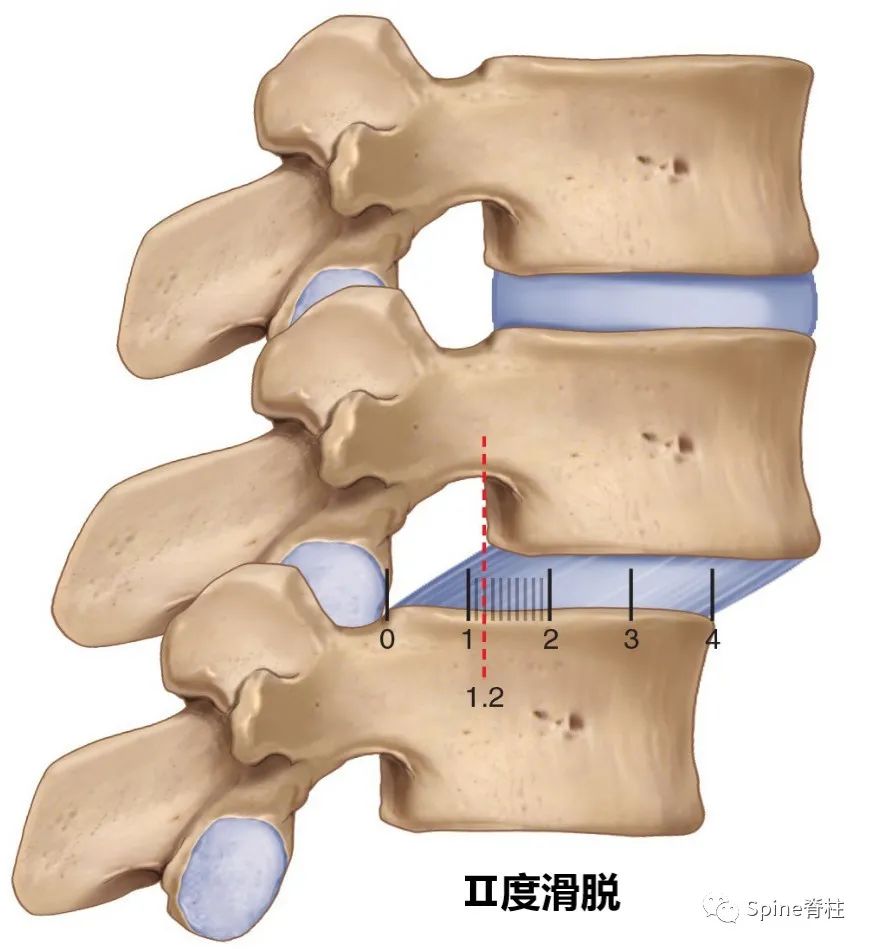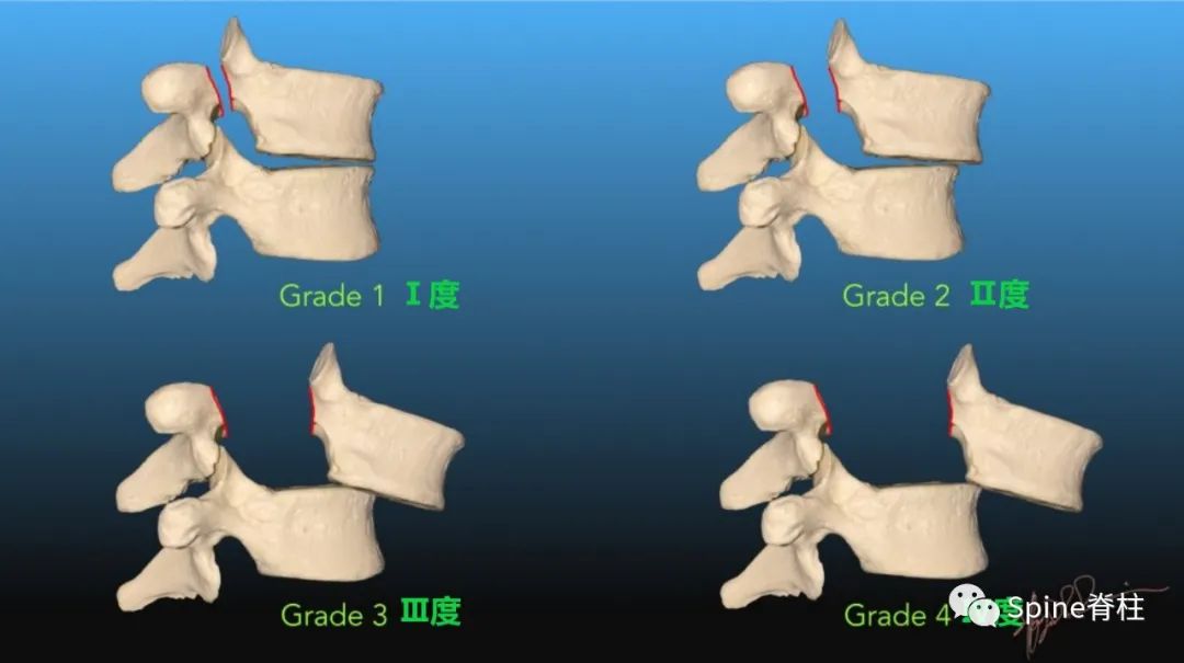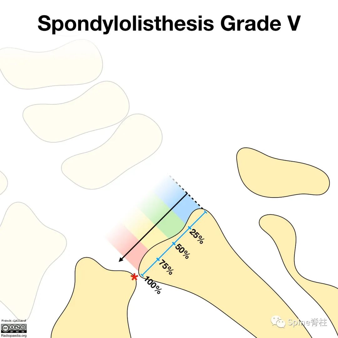 在Meyerding原始文献中,将腰椎滑脱分为四级(Ⅰ-Ⅳ度)。而通常使用的Ⅴ度,代表超过100%的滑脱或脊柱下垂,不是原始分级系统的一部分。