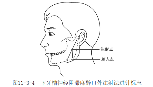 注射方法:注射时嘱患者牙齿呈咬合接触,拉开唇颊部暴露上后牙颊面,在下颌支与上颌结节之间将注射针刺入上颌第一磨牙颊侧牙龈与黏膜交界线水平的稍后部黏膜下。进针方向与上颌后牙给平面平行,进针约2.5~3cm,回抽无血后注入麻药2~3ml。3.下颌下缘注射法此法亦适用于开口受限者。注射标志:自耳屏中点至咬肌前下角做一连线,其中点即相当于下颌支内侧下颌孔上方的下牙槽神经沟处,由中点再与下颌支后缘平行做一垂线到达下颌下缘,此垂线方向和长度即为注射针应注入的方向和深度。注射方法:取6cm的长针头,将无菌橡皮片穿于注射针上,按上述垂线长度做好标记。嘱患者仰头并偏向对侧,针自下颌下缘内侧刺入皮肤,在下颌支内侧面沿垂线方向推进至橡皮片表示的深度,注射麻药5ml,即可麻醉下牙槽神经(图11-3-4)。
