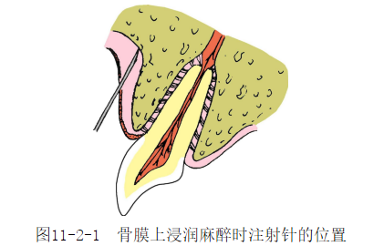 一、骨膜上浸润法骨膜上浸润法是将麻醉药注射到牙根尖部位的骨膜浅面。注射方法:首先根据注射部位的要求调整好患者的椅位,告知患者注射之初可有微痛,以防因针刺不适而突然移动,导致断针或加重疼痛。牵引注射处黏膜,使之绷紧,在拟麻醉牙的唇颊侧前庭沟进针。当注射针头刺入根尖平面的骨膜上后,可松弛黏膜,使注射麻醉药易于弥散和渗透。根据骨质结构和手术的难易程度,酌量注入麻药0.5~2ml(图11-2-1)。注意点:进针部位不要距离颌骨太远;注射针进入软组织不要过深;注射的药量必须考虑颌骨的厚度和密度。