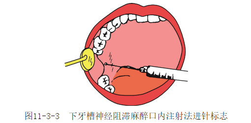 1.常规口内注射法注射标志:患者大张口时,可见磨牙后方翼下颌韧带表面的翼下颌皱襞。在颊部有一由脂肪组织突起形成的三角形颊脂垫,其尖端正居翼下颌韧带中点稍偏外处。若颊脂垫尖不明显或磨牙缺失的患者,可在大张口时,上下颌牙槽嵴相距的中点线与翼下颌皱襞外侧3~4mm的交点,作为注射标志。注射方法:患者大张口,下颌颌平面与地面平行。将注射器放在对侧口角,即第一、第二前磨牙之间,与中线成45°。注射针应高于下颌给面1cm并与之平行。按上述的注射标志进针,推进2.5cm左右,可达下颌支内侧的下颌神经沟,回抽无血注入麻药2m(1图11-3-3)。因舌神经在下牙槽神经注射水平线上正位于其前内方约1cm处,故在下牙槽神经麻醉注射后,将针退出约1cm,注射麻药0.5ml,即可麻醉舌神经。