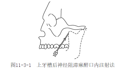 一、上牙槽后神经阻滞麻醉上牙槽后神经阻滞麻醉是将局麻药注射于上颌结节,以麻醉上牙槽后神经,又称上颌结节注射法。本法适用于上颌智牙的拔除以及颊侧牙龈、黏膜的麻醉。注射标志:以上颌第二磨牙的远中颊侧根部的前庭沟作为进针点,上颌第二磨牙未萌出的儿童,以上颌第一磨牙远中颊侧根部的前庭沟为进针点;上颌磨牙己缺失的患者,则以颧牙槽嵴部的前庭沟为进针点。注射方法:注射后,患者采取坐位,头微后仰,上颌颌平面与地平面呈45°,半张口,用口镜将口颊向后上方牵开,以显露进针点。注射针与上颌牙的长轴成45°角,向上后内方刺入;针尖沿着上颌结节弧形表面滑动,深约2cm。回抽无血,即可注入麻醉药1.5~2ml,3~5分钟显效(图11-3-1)。注意点:进针不宜过深及过上,以免刺破上颌结节后上部的翼静脉丛,引起血肿;沿上颌结节表面滑动进针,如果进针方向不正确或内转不够,麻药远离上颌结节亦使麻醉失败。