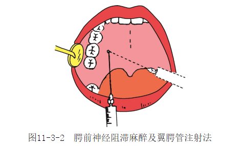 二、腭前神经阻滞麻醉腭前神经麻醉是将麻药注入腭大孔或其附近麻醉腭前神经,又称腭大孔注射法。此法适用于上颌磨牙拔除术的腭侧麻醉。注射标志:表面标志为腭大孔,该孔位于上颌第三磨牙腭侧龈缘至腭中线弓形凹面连线的中点,黏膜表面可见腭小凹。若第三磨牙尚未萌出,则以第二磨牙之腭侧进针。若从颌平面观,腭大孔位于腭侧龈缘至腭中线连线的中外1/3交界处。注射方法:患者头后仰,大张口,上颌平面与地平面成60°角。注射针在腭大孔的表面标志稍前处刺入腭黏膜,往上后方推进至腭大孔,注入麻药0.3~0.5ml。3~5分钟麻药起效(图11-3-2)。注意点:腭大孔麻醉注射部位不宜过后,麻醉量亦不宜过大,否则其后的腭中、腭后神经可能被麻醉,引起患者恶心、呕吐等。