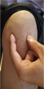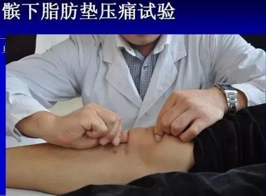 髌下脂肪垫挤压试验:患者仰卧位,检查者立于患者右侧,以左手拇、食指指端分别按住髌骨底的内外缘推向远侧,使髌骨尖向远端凸出,右手拇指罗纹面朝上,指尖针对髌尖粗面及髌骨下1/2段边缘进行适度滑动触压,若引出疼痛,是为本病的阳性体征。