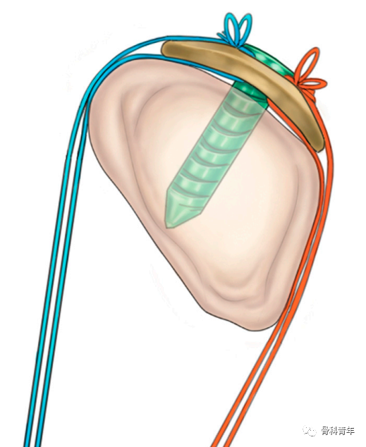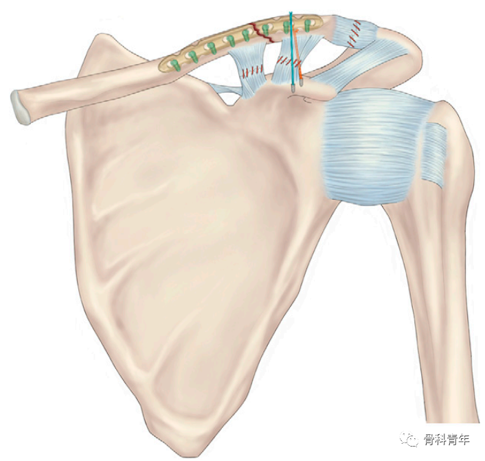 先采用锁骨解剖钢板固定锁骨骨折,复位脱位的肩锁关节后,在喙突置入两枚金属锚钉,并将锚钉自带缝线分别穿过锁骨钢板螺钉孔,在锁骨前方及后方分别打结固定,最后采用缝线直接缝合肩锁韧带及喙锁韧带: