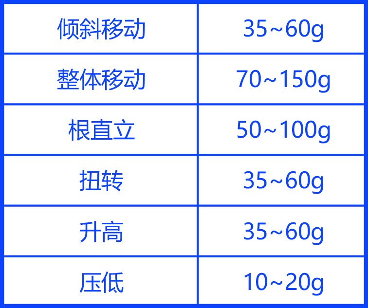 临床上,正畸医师总是希望能找到一个最适矫治力,运用它产生最有效的牙齿移动效果。以下是临床上移动不同牙齿的指导矫治力值: