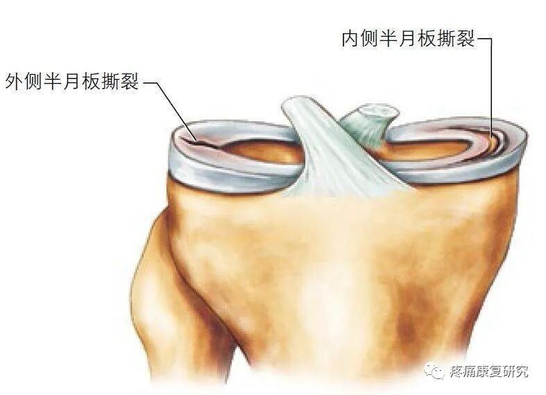 系内侧半月板纵行破裂。并可在前或后角部断裂,游离部进入膝内,成为膝痛和伸屈阻挡的主要因素。