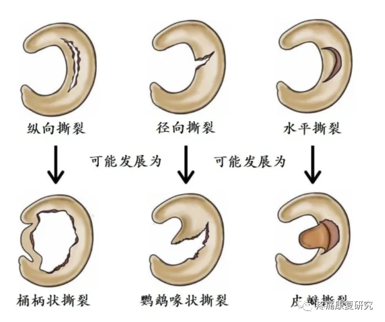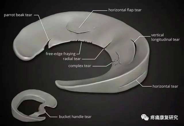 parrot beak tear 斜行(鹦鹉嘴)撕裂horizon flap tear 水平瓣状撕裂vertical longitudinal tear 垂直纵行撕裂Horizontal tear 水平撕裂bucket handle tear 桶柄状撕裂complex tear 复杂性撕裂radical tear 放射状撕裂Free-edge fraying 游离缘磨损
