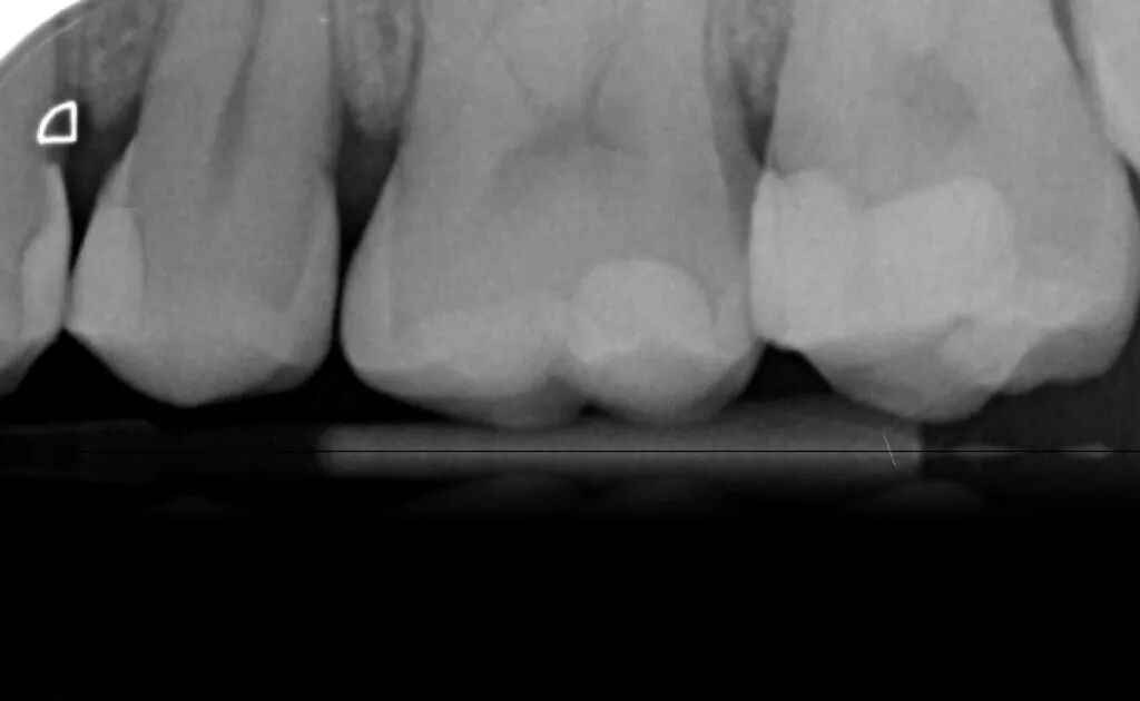 图1. 一位患者主诉左上后牙食物嵌塞咬合不适。左上象限(从第一前磨牙至第二磨牙)龋病情况如图。