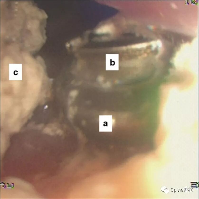 图示:内窥镜照片。经过仔细检查,我们食管憩室的一角发现了钢板的边缘“a”和螺丝“b”。“c”表示前一天吞钡后的剩余钡。