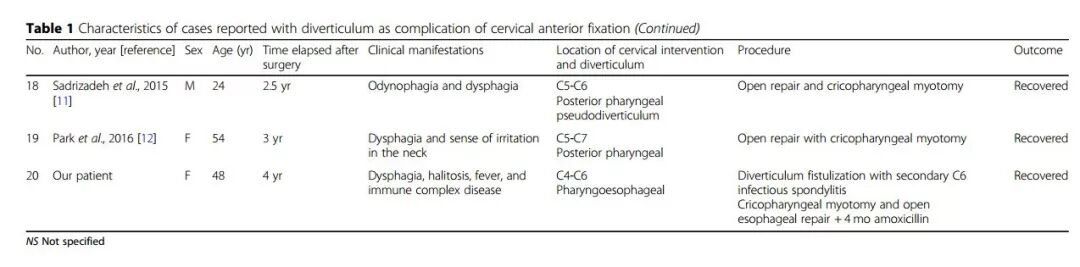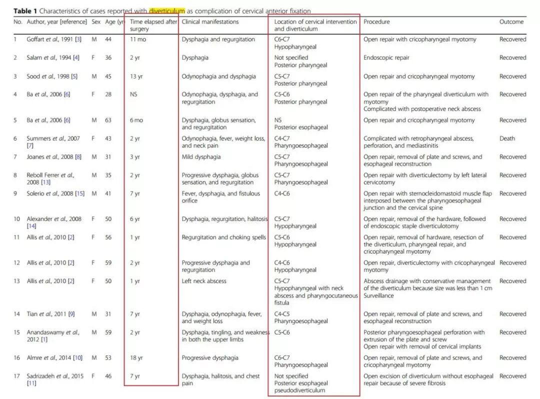 2019年,墨西哥学者Patricia Volkow-Fernández教授进行了一项颈椎术后食管憩室的文献回顾,目前共有20例报道。