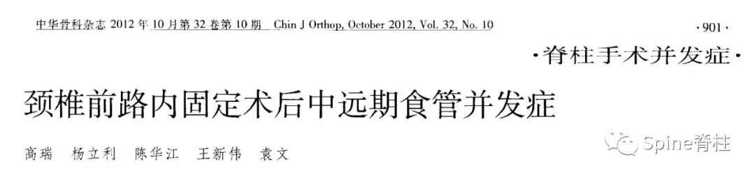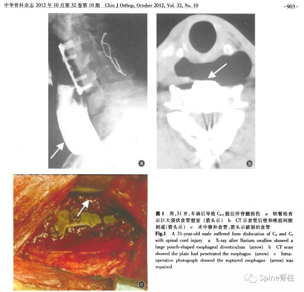 食管并发症是颈前路手术少见而严重的并发症,最常见的是食管穿孔,一般发生于术中或术后早期,临床医师对食管穿孔大多有些认识,相对容易诊断和发现,文献报道发生率为0.05%-1.2%。