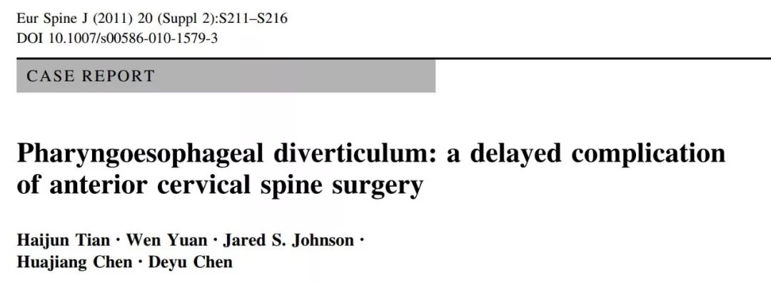 国内,2012年袁文教授团队在中华骨科杂志发表文章,对颈椎前路内固定术后中远期食管并发症进行了回顾性总结,2316例患者中,共3例出现食管憩室,其中1例合并有食管穿孔。