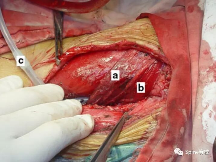 肌肉皮瓣加固修复完成。a:胸骨舌骨肌瓣,b:舌骨肌瓣,c:引流管。
