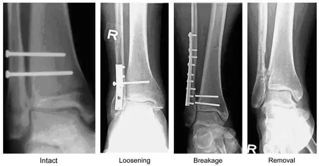由左向右分别为完整、松动、断裂、取除后的下胫腓联合螺钉(图片来自文献 [1])
