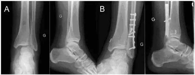 A 一例典型的 Weber C 型骨折;B 开放复位并使用带袢纽扣钢板固定术后踝关节正侧位片(图片来自文献 [7])
