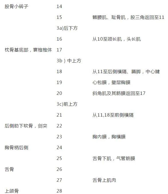 6、上斜方肌患者体位:侧卧位、肩关节内旋;操作程序:治疗师半握拳推压斜方肌上侧,向下压向上挑,注意不要压到动脉和气管。