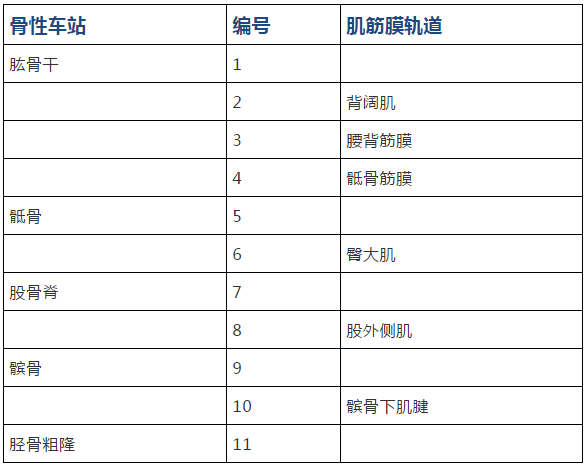 体侧线位于身体两侧,起自足内侧与外侧的中点,从踝外侧上行,经小腿和大腿的外侧面,以“鞋带交叉”方式上至躯干,由肩部下方上行至头颅的耳部区域。其功能是调整身体前后和左右的平衡,同时它还能对其他表层线(前表线、后表线、所有手臂线、螺旋线)之间的力量进行调节。