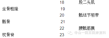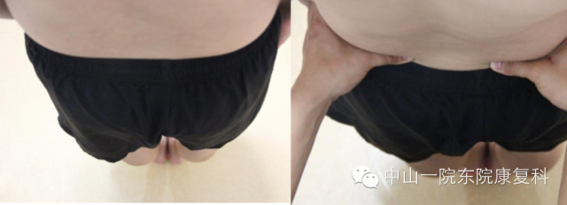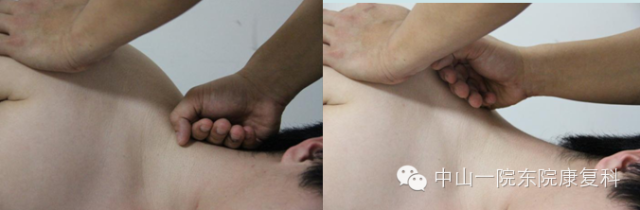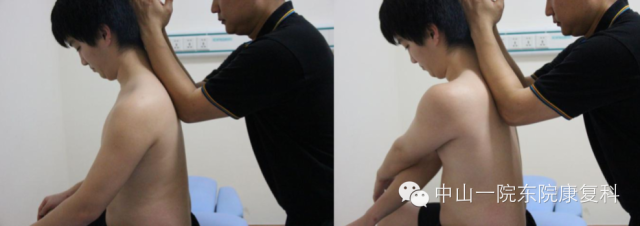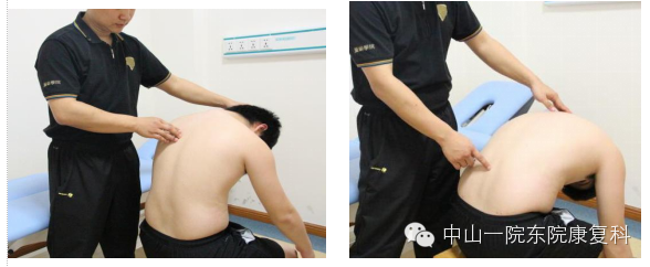4、竖脊肌患者评估:坐位,嘱患者先低头,然后依次屈曲颈段、胸段以及腰骶部脊柱,观察各段有无活动受限。