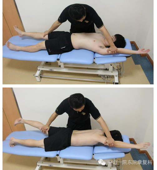 前、后功能线的评估与练习患者体位:俯卧位;评估:治疗师一手置肱骨远端,另一手置于对侧下肢股骨远端,嘱患者上下肢同时后伸,观察患者上下肢是否同时发力及动作协调性;练习:起始姿势同评估体位,用手引导患者同时发力或先刺激滞后发力肢体,注意观察动作质量,并逐渐增加阻力。