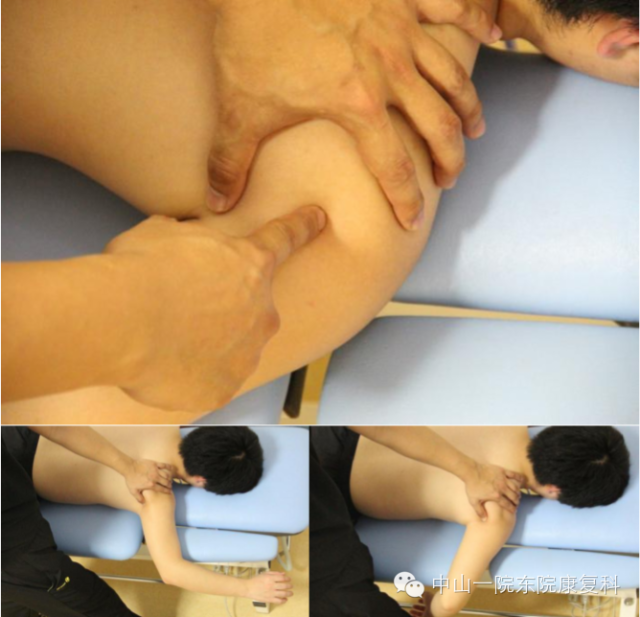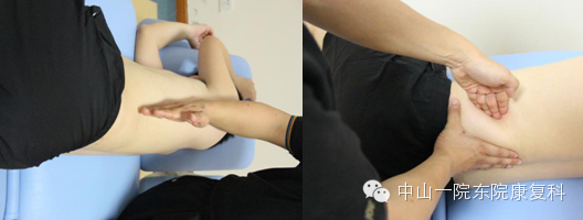 3、阔筋膜张肌、臀中肌、臀大肌患者体位:侧卧位;操作程序:治疗师用肘关节抵住各部位肌肉,缓慢下压,患者膝关节伸直,同时做髋关节内旋、外旋。