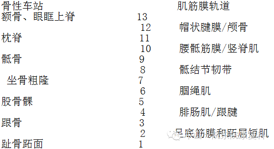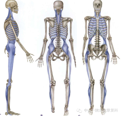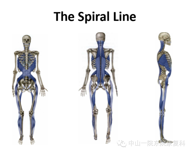 螺旋线以螺旋的方式围绕身体,将颅骨的一侧连接到对侧肩膀,接着再向下连接到同侧髋的前方,再到膝,绕过足弓,从身体的背侧向上直到与颅骨的筋膜重合。