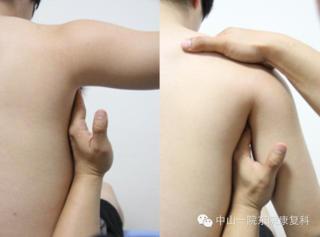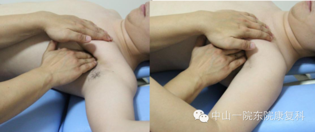 3、肩胛下肌/盂肱关节关节囊松解患者体位:坐位;治疗:患者患侧手臂外展90度,治疗师一侧手四指触及腋窝,患者手臂放下放松,治疗师另一侧手在肩关节上方加压,腋窝侧手触及肱骨头后,逐步向上,向外,向下施力;注意事项:肩关节上方手始终加压,治疗手切勿用力过猛。