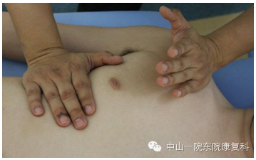 (2)治疗师一手小鱼际置于喙突,另一手在身体侧T5-6处,呼气时依次是上方手先向足侧推——下方手向中心推胸廓——下方手掌根部向足侧转动;吸气时依次返回。