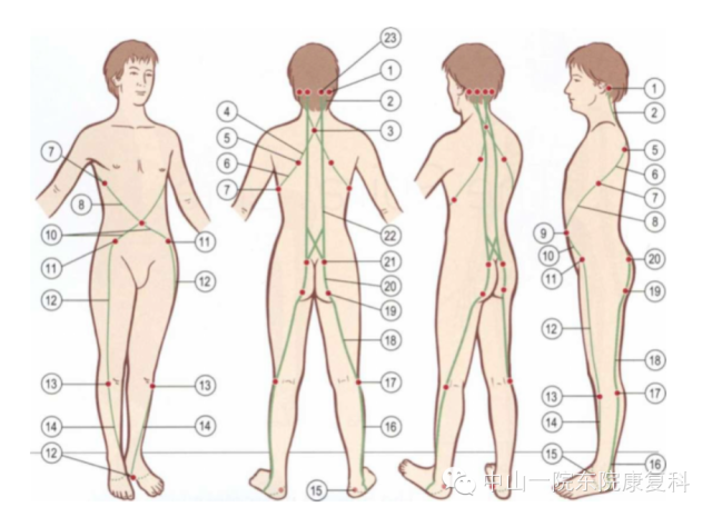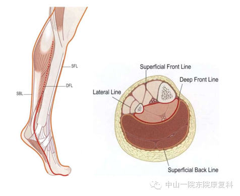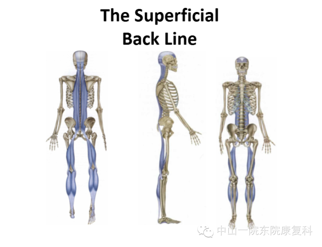 前表线(The Superficial Front Line,SFL)连接人体的整个前表面,下起自足背,上至头颅的两侧,可分为脚趾到骨盆和骨盆到头颅两部分。在髋关节处于伸展位时,如站立,这两部分会作为一个连续的筋膜协同作用。