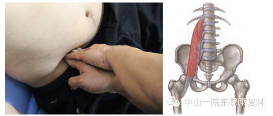 7、腰方肌(腰方肌是前深线的一部分,但常在体侧线上发现问题,故在此介绍)方法一:患者体位:侧卧位,屈髋屈膝;操作程序:治疗师先找出患者体中线,一手稳定患者腰部,另一手掌伸直,用指尖从髂棘和体中线交界处向后方插入,令患者在屈髋位下坐骨盆下沉-上提的动作。