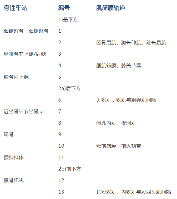 3、腘绳肌患者体位:俯卧位,屈膝90°;操作程序:治疗师的操作手的四肢指尖放在腘绳肌内外侧头之间,患者配合做膝关节内外旋的同时治疗师的操作手的指尖做滑动。