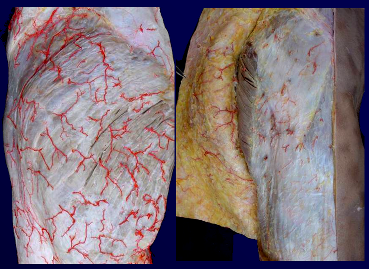 穿支从主干末端或外侧支发出(2~4支):1、2支较恒定;腋后襞下方8 cm处;背阔肌外缘2~3cm;外径0.5~0.6 mm;皮瓣面积8cm×15cm