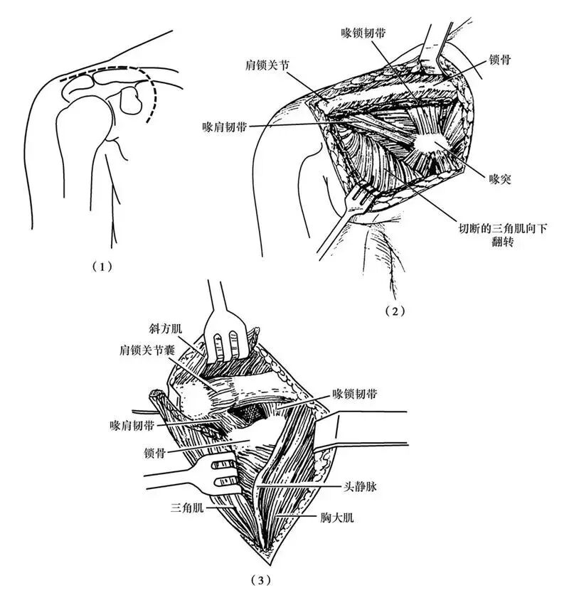 (1)切口;(2)显露三角肌起点,将其从肩峰前缘和锁骨分离,并向外下方翻转,显露喙突及其附着韧带;(3)显露肩锁关节