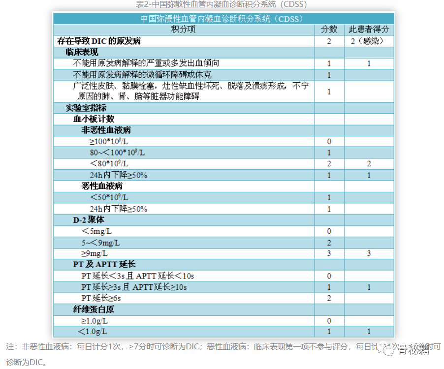1.DIC早期:又称为微血栓形成期或高凝期,以全身弥漫的微血栓形成为主。由于此期病理过程较短(常转瞬即逝)而易被忽视,错失抢救的黄金时机,因而DIC的早期识别尤为重要。临床医生应在下列症状出现时提高警惕:广泛性皮肤、黏膜栓塞,灶性缺血性坏死、脱落及溃疡形成;不明原因的呼吸浅快、低氧血症;不明原因的肺、肾、脑等脏器功能衰竭;顽固性休克等。实验室检查特点:凝血酶原时间(PT)、活化的部分凝血活酶时间(APTT)正常或缩短,血小板计数和纤维蛋白原不低。