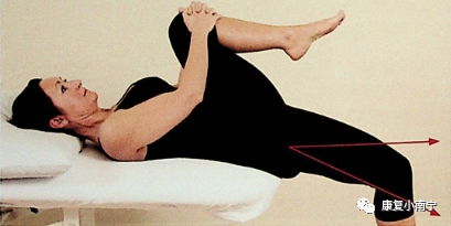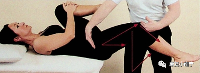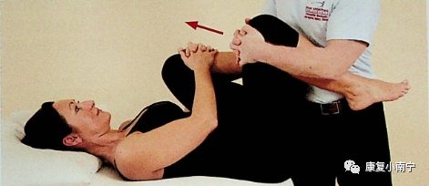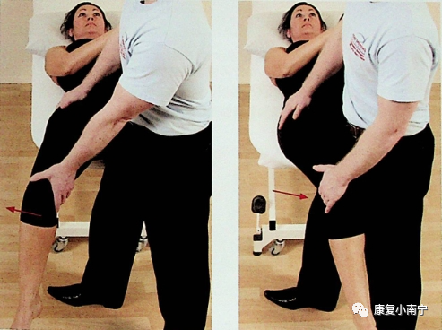 在治疗右侧时,患者采用与上述改良的托马斯试验相同的姿势。患者的左足倚靠在治疗师的身体右侧,治疗师施加压力,以引导患者的左髋进入完全屈曲的状态。