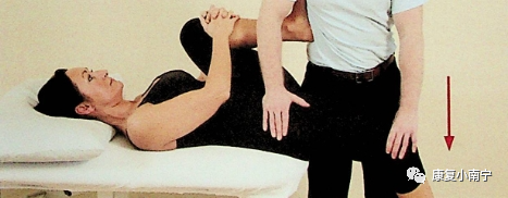 治疗师用右手稳定患者的右髋,将左手放在患者的右膝之上,要求患者屈右髋以对抗治疗师施加的阻力10秒,如图所示。