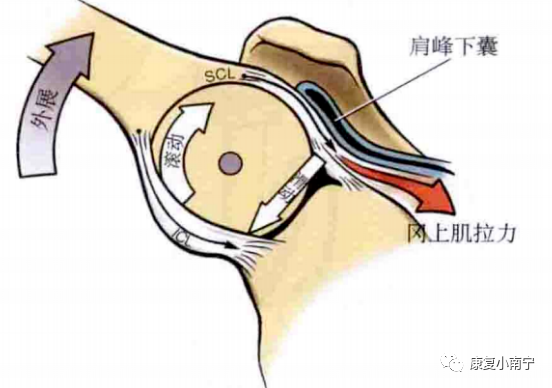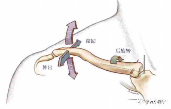 在肩关节外展180°时,盂肱关节完成外展的120°,肩胛胸廓关节完成外展的60°,其中肩胛骨上回旋的60°中又必须包含有胸锁关节的活动,即锁骨也应该上抬30°同时向后旋转。