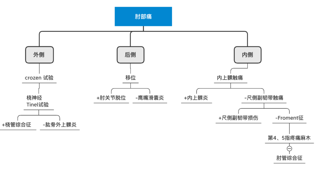 Tinel 试验:可以用来鉴别桡管综合征和肱骨外上髁炎,在桡神经体表投影位置向肱骨外上髁的远端叩击桡神经,如再次诱发疼痛即桡管综合征。