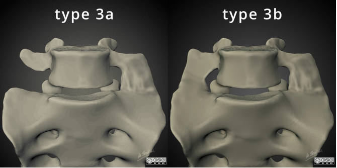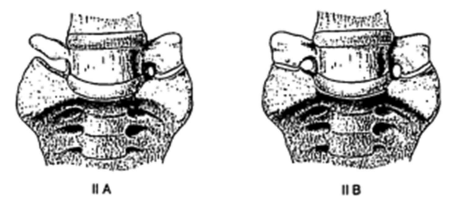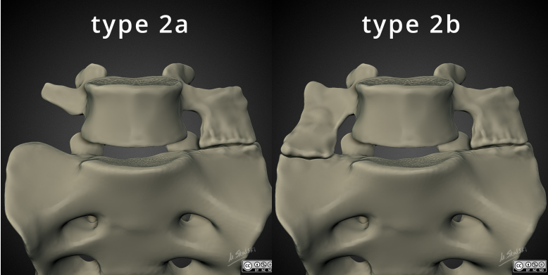 II型:表现为不完全的腰椎骶化,具有增宽的横突,并且和骶骨形成假关节,并将其分为两个亚型IIa(单侧关节形成)或IIb(双侧关节形成)
