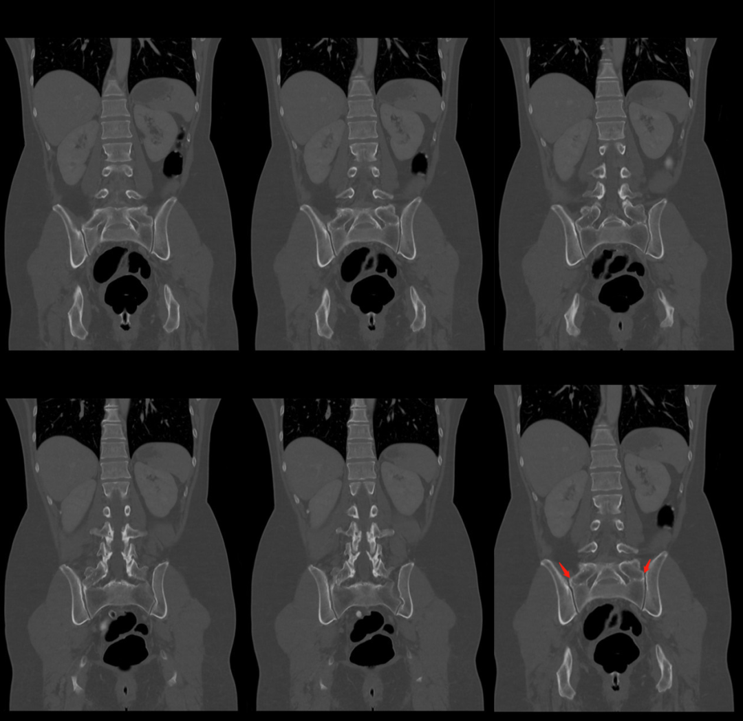 L5 双侧横突与骶骨骨性融合,为 Ⅲb 型IV型:一侧为II型即腰5横突与骶骨形成假关节,对侧为III型即腰5横突与骶骨形成骨性融合