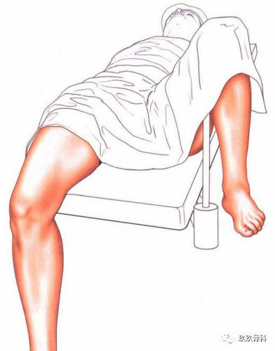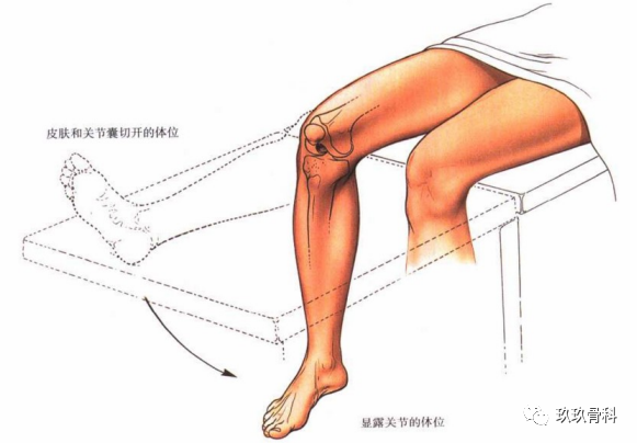 图10-9内侧骸旁入路的患者体位。开始时直腿位置,然后屈曲膝关节行深层切开。