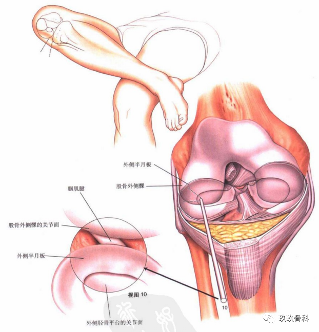 图10-8在髋的上方、屈曲膝至90°,将手术侧的外踝置于对侧膝的前方(“8”字位置)视图10:经关节镜进至膝的外侧室,观察整个外侧半月板。